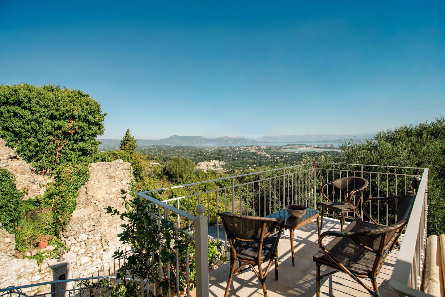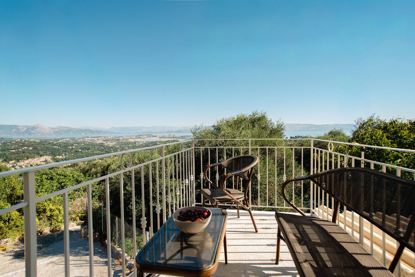 The mountain cottage includes a patio, a balcony overlooking Corfu and the sea!